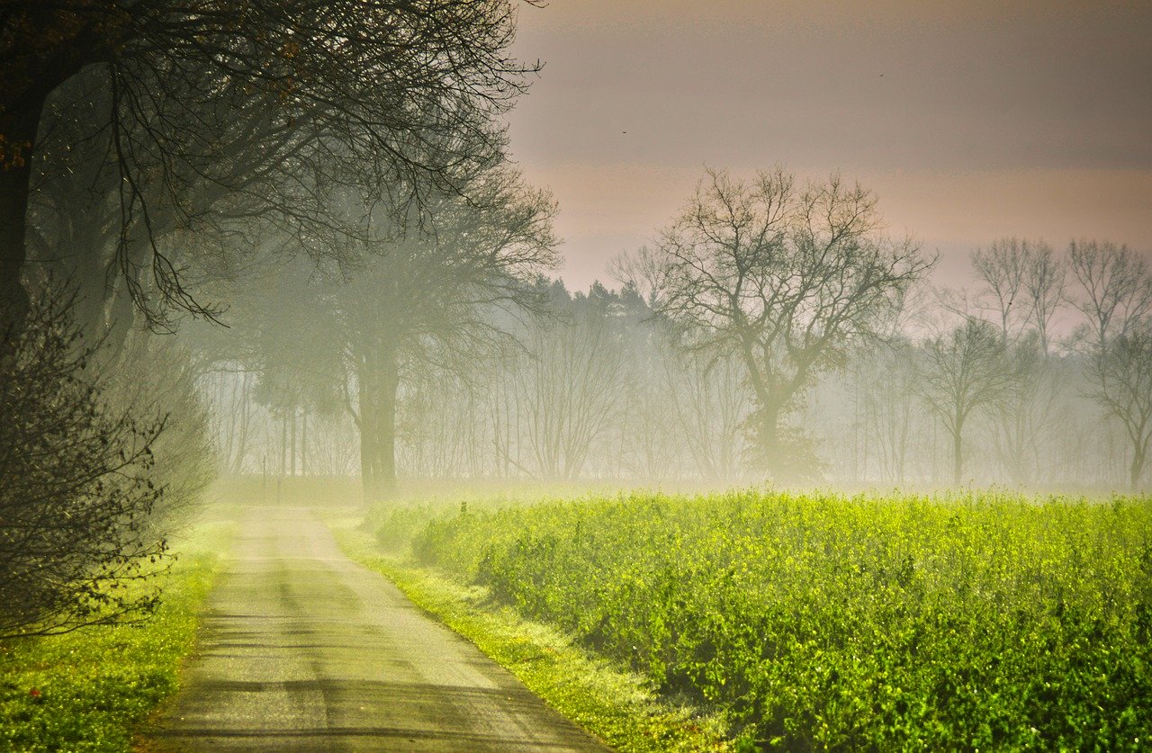 autumn-3900048 秋 日の出 道路 霧 菜種のフィールド ビンズイ 黄色 フォレスト 木 地獄 太陽 光