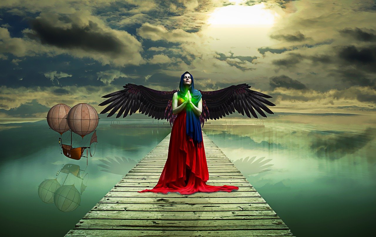 woman-3839760 女性 巫女 神秘的 ファンタジー 祈る 桟橋 山 自然 湖